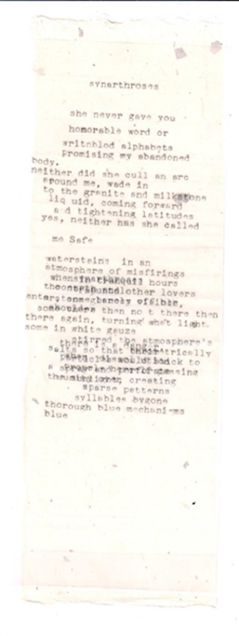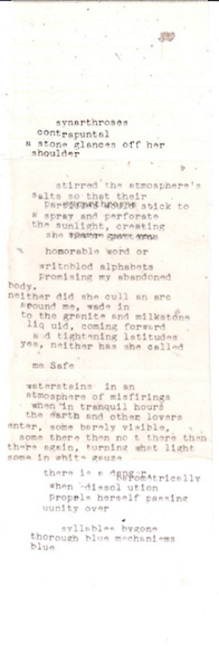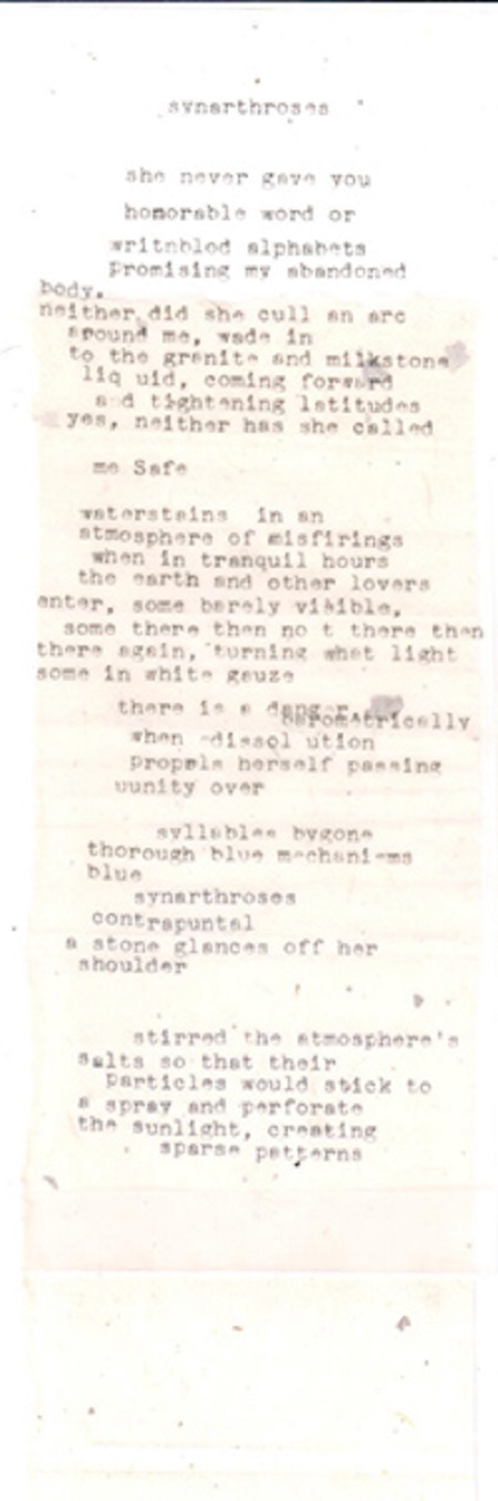 One day, several years prior to synarthroses construction, Cathy asked for a sight-sound translation into our vernaculars of a czechoslovakian poem, one seventeen-centimeter wide sheet. You had a hope to explore this in "purity" using only technical sensation - an experiment in aural and aesthetic association. [No longer do I fear that I entered with insensitive, romantic laziness - I did, and still often do.] A cause to wonder who our teachers are, living ancestors or echoes, that continue to guide our mouths into shapes. Is it a shadow pushing (or punishing) your want, to hear a word, here? Sometimes a czech combination bore an analog sound you could recognize, american english, punjabi, french. Felt fragment field contortion, later hearing internal ricochet. At moments you desired (a) grammatical hierarchy to provide a kind of logic to the si-glyph-iers, and other times the process caused spittle, which perhaps distilled the assignment's elegance. The original poem would hold its ground, the language but itself.